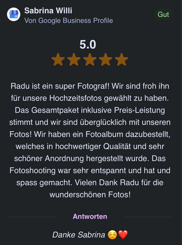 Als Hochzeitsfotograf halte ich gerne große, echte Emotionen fotografisch und videografisch fest. Und natürlich in den Momenten, in denen ihr nicht mitbekommt, dass ich euch aufnehme. Diese Emotionen sind es, die eure Hochzeitsfotos und Hochzeitsvideos unvergesslich und einzigartig machen. Ein echtes, gewolltes Lachen bedeutet mir viel mehr als eine perfekte Pose. Bei jeder Aufnahme erhoffe ich, dass sich die Partner erneut ineinander verlieben und sich ihr Glück in den Aufnahmen widerspiegelt.